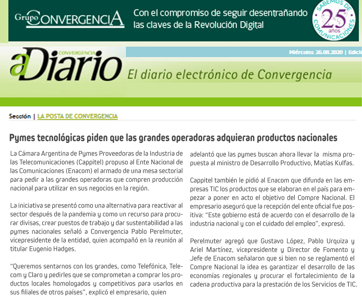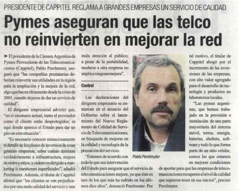 Así lo afirmó Pablo Perelmuter, presidente de la Cámara Argentina de Pymes Proveedoras de la Industria de las Telecomunicaciones (Cappitel), en una reunión con representantes del Gobierno Nacional, donde presentaron las principales propuestas para promover el crecimiento del sector.